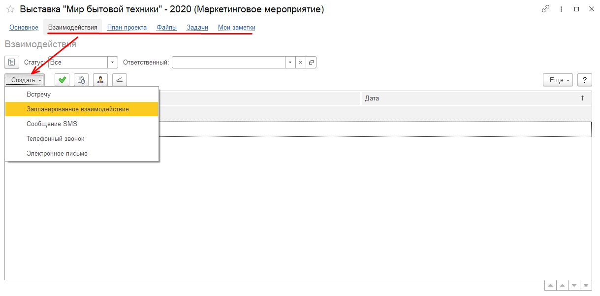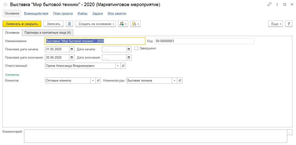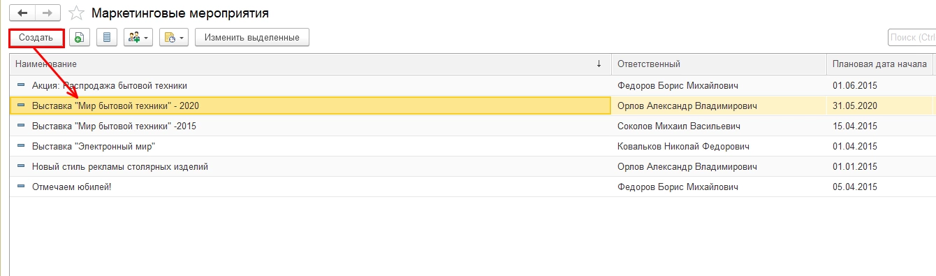 Пользователь может создавать различные маркетинговые мероприятия: выставки, акции, реклама в соцсетях и т.п. Для примера мы создали маркетинговое мероприятие – Выставка «Мир бытовой техники-2020» (кнопка «Создать»).