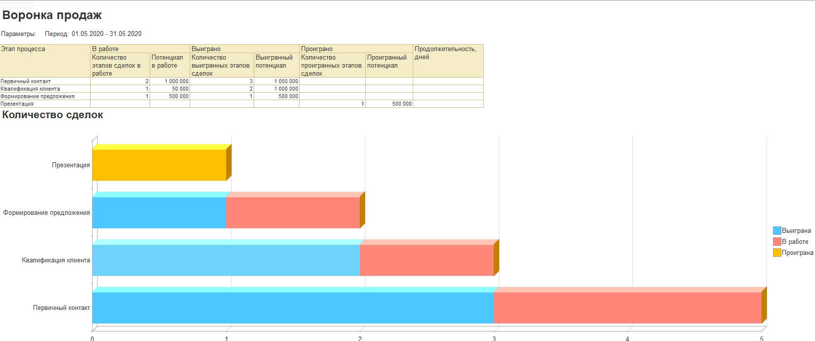 Построив «Воронку продаж» (раздел меню «CRM и маркетинг» - «Отчеты по CRM и маркетингу») мы видим, что на этапе «Первичный контакт» у нас было зафиксировано 5 сделок. На этапе «Презентация» одна сделка была проиграна (клиент передумал покупать оборудование), одна сделка находится на этапе «Формирование предложения», одна – на «Квалификации клиента».