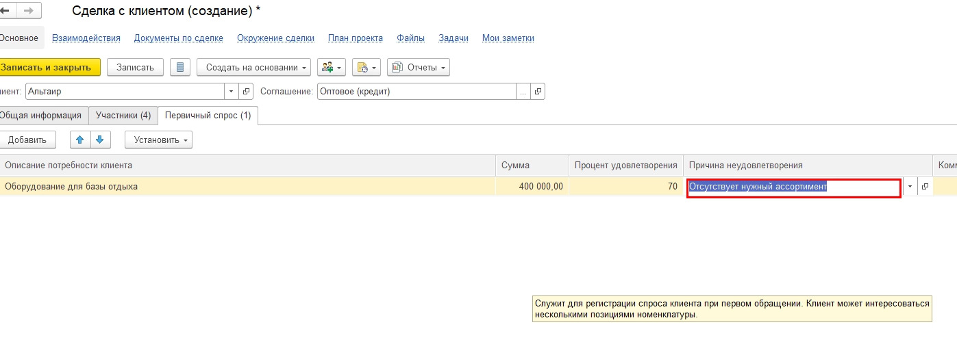 На закладке «Первичный спрос» указывается, какой товар хочет приобрести клиент, и фиксируется удовлетворенность спроса клиента для регистрации спроса при первом обращении. Клиент может интересоваться несколькими позициями номенклатуры.