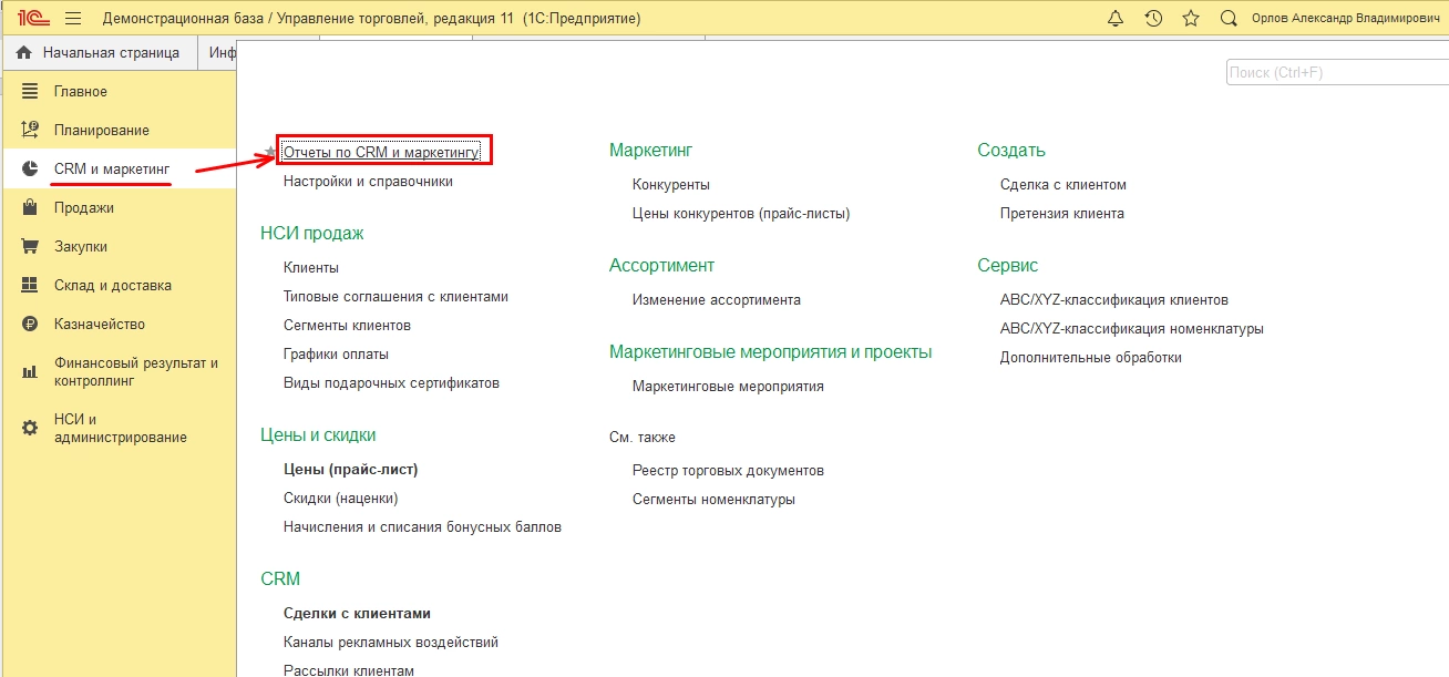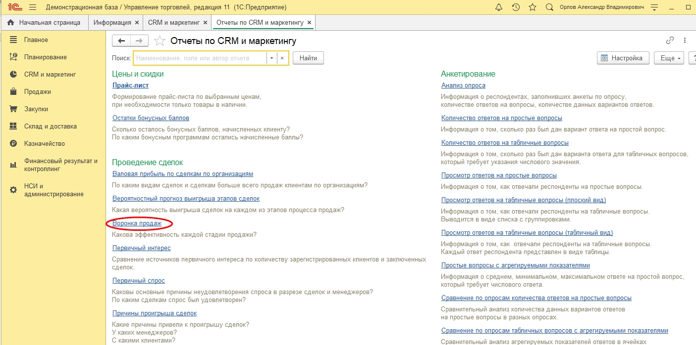 Отчет «Воронка продаж» находится в разделе меню «CRM и маркетинг» - «Отчеты по CRM и маркетингу».