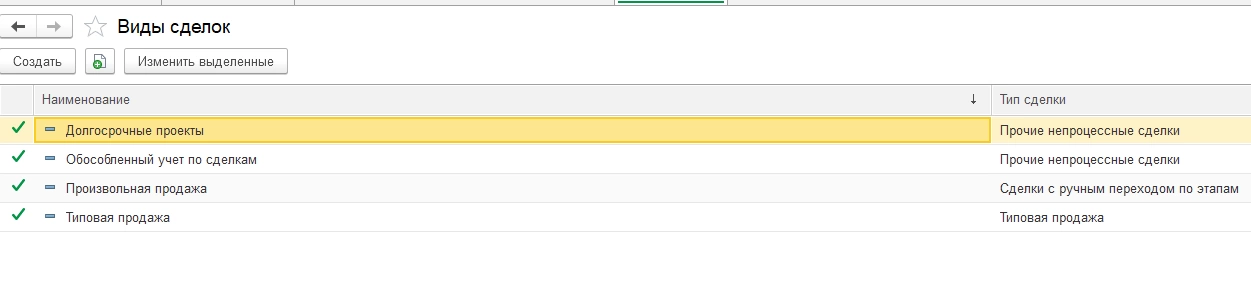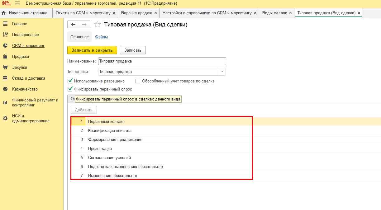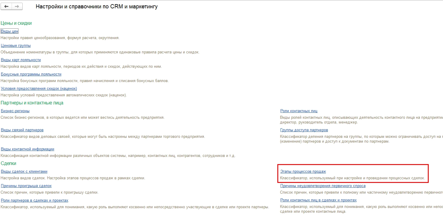 В программе предусмотрена возможность использования бизнес-процессов, имеются предопределенные «Виды сделок», в которых уже определены этапы, например, «Типовая продажа» - раздел меню «CRM и маркетинг» - «Настройки и справочники» - «Виды сделок».