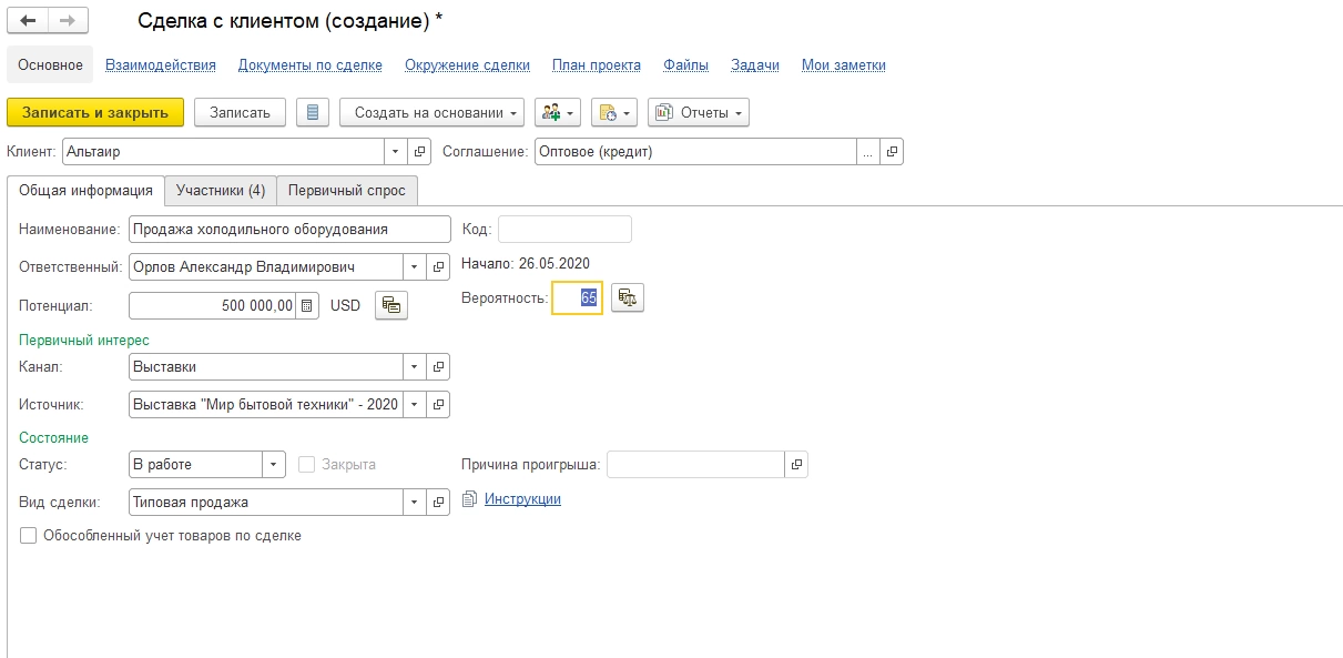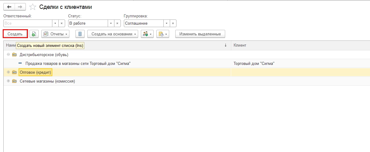 Непосредственно в справочнике «Сделки с клиентами» с помощью кнопки «Создать» также можно зафиксировать сделку.