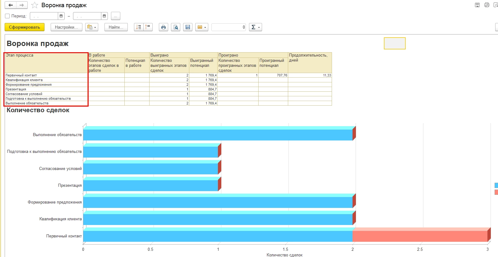 После перехода от этапа первичного контакта к следующему (в нашем примере – Квалификация клиента, Формирование предложения и т.д.) сделка учитывается и на этапе первичного контакта, и на следующих ее этапах. Т.е. одна и та же сделка будет учтена и на всех этапах прохождения клиента.