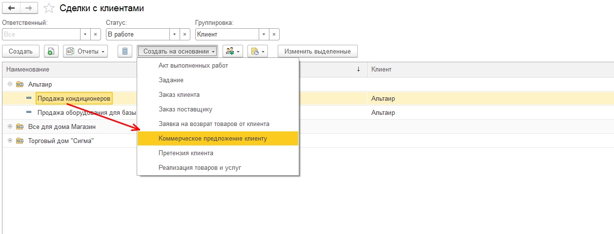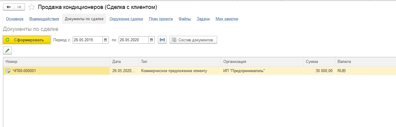 Шаг 3. Из справочника «Сделки» пользователь может сформировать любой документ по контрагенту, проходя тем самым через «воронку» дальше.