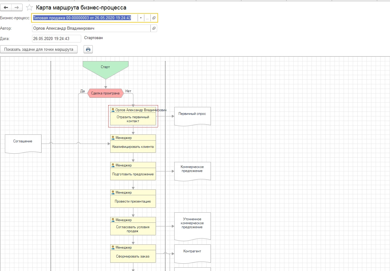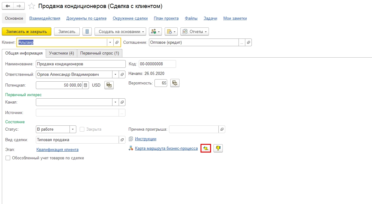 На закладке «Этапы процесса» мы видим этапы сделки, определенные типом сделки «Типовая продажа». В этом типе сделки применяется контроль каждого этапа.