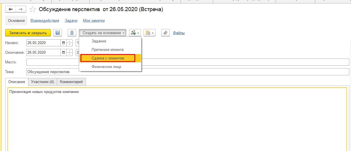 Сделку можно ввести непосредственно из формы взаимодействия (например, телефонный звонок, встреча, электронное письмо и т.д.), выбрав команду «Сделка с клиентом».