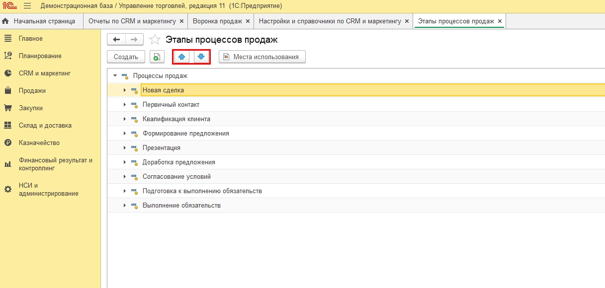 Здесь находится предопределенный список этапов. Пользователь может сам дополнить список этапов процесса продаж (кнопка «Создать»), меняя при необходимости их последовательность с помощью кнопок «Переместить вверх» и «Переместить вниз», что в итоге будет влиять на порядок движения процесса продаж по этапам сделки.