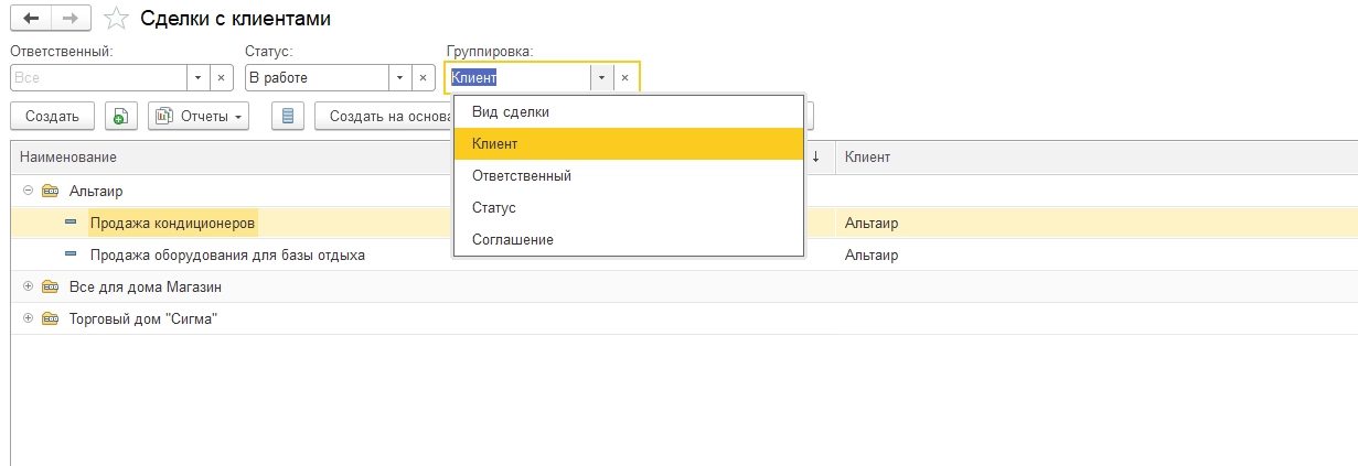 В справочнике «Сделки» пользователь может группировать сделки по виду сделки, клиенту, ответственному лицу, статусу, соглашению.