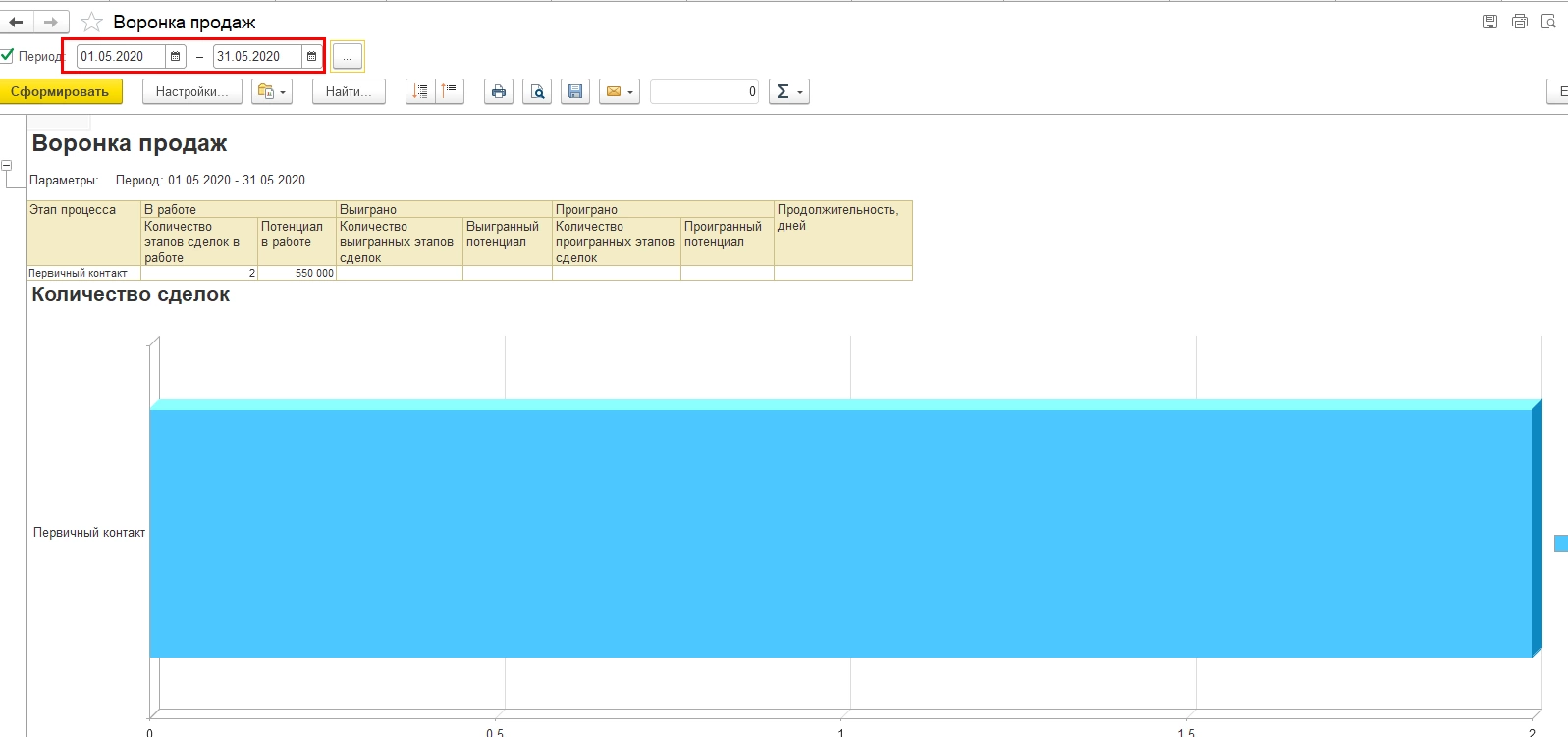 Сформируем на этом этапе «Воронку продаж» – раздел меню «CRM и маркетинг» - «Отчеты по CRM и маркетингу», за текущий период. На этапе «Первичный контакт» у нас зафиксировано 5 сделок.