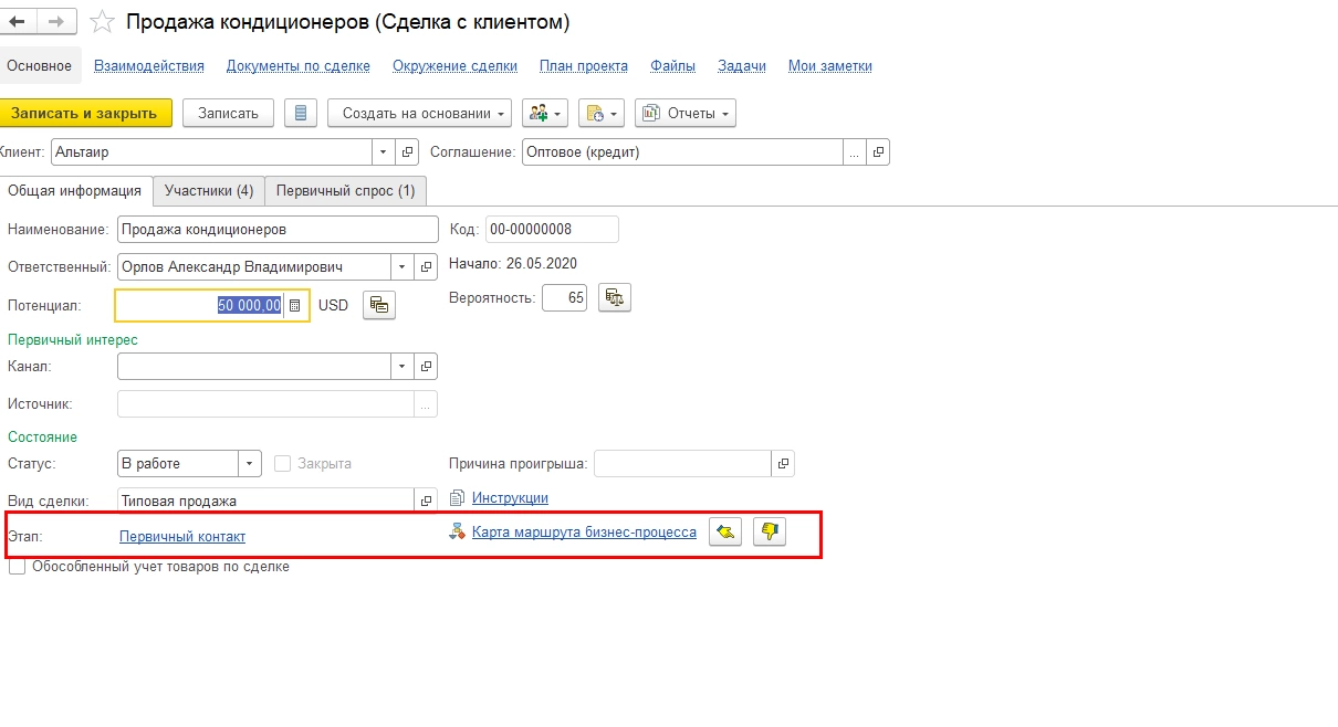 Открыв карточку сделки, мы видим, что наша сделка находится на этапе «Первичный контакт» и, нажав на гиперссылку «План процесса», этапы процесса сделки, где текущий этап отмечен зеленой точкой.