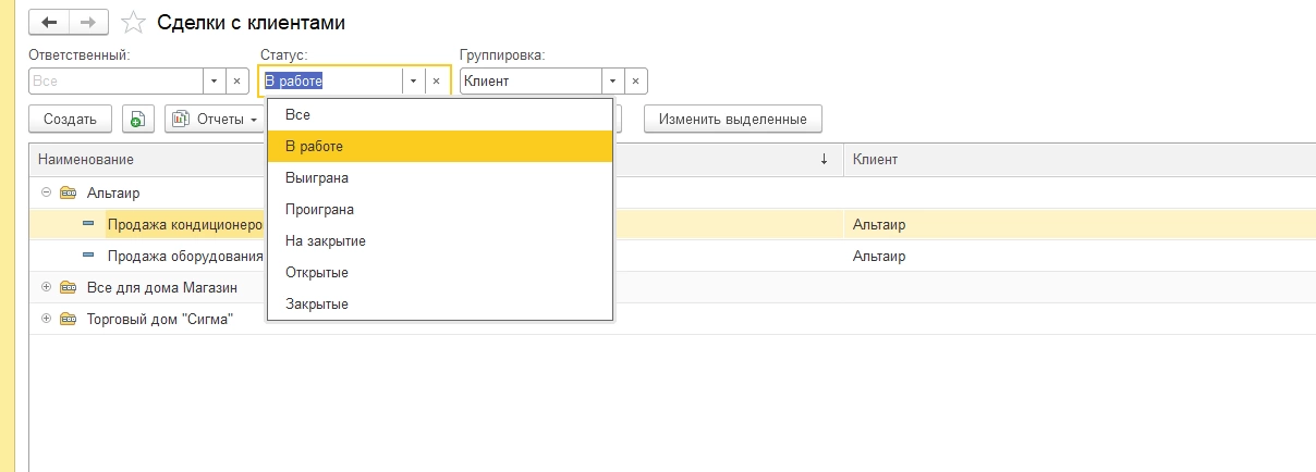 Также можно отдельно отобрать сделки по статусу, например – в работе, выиграна, проиграна, на закрытие, открытые, закрытые.