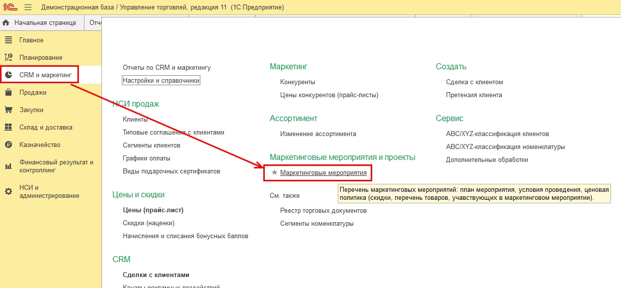 Шаг 1. В разделе «CRM и маркетинг» - «Маркетинговые мероприятия и проекты» имеется справочник «Маркетинговые мероприятия», данные которого используются как источник рекламного взаимодействия при регистрации сделки с клиентом.