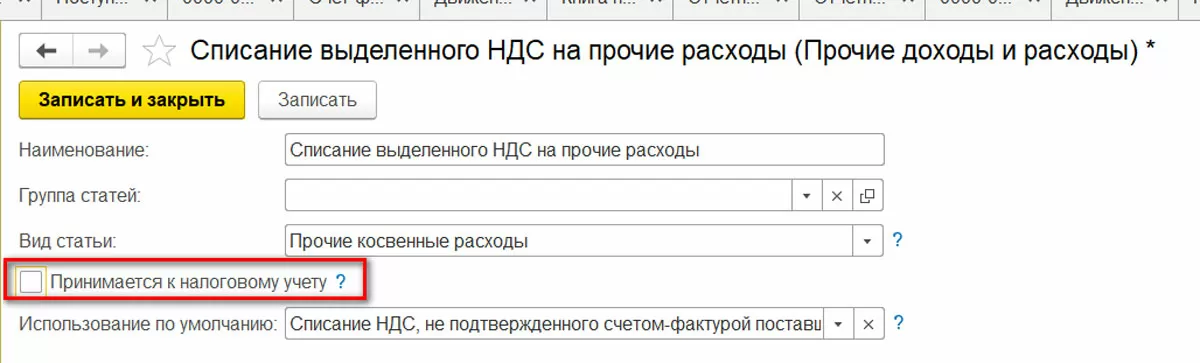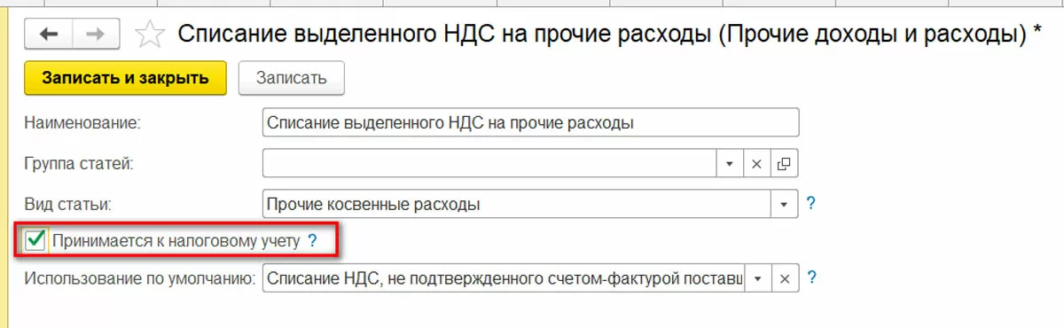 Обратите внимание на значение справочника расходов. Здесь можно установить параметр, принимаются ли расходы в затраты в целях исчисления налога на прибыль или нет.