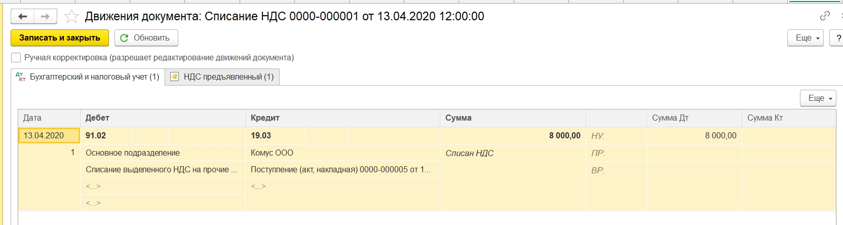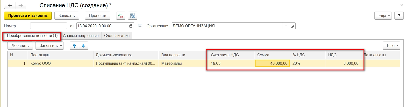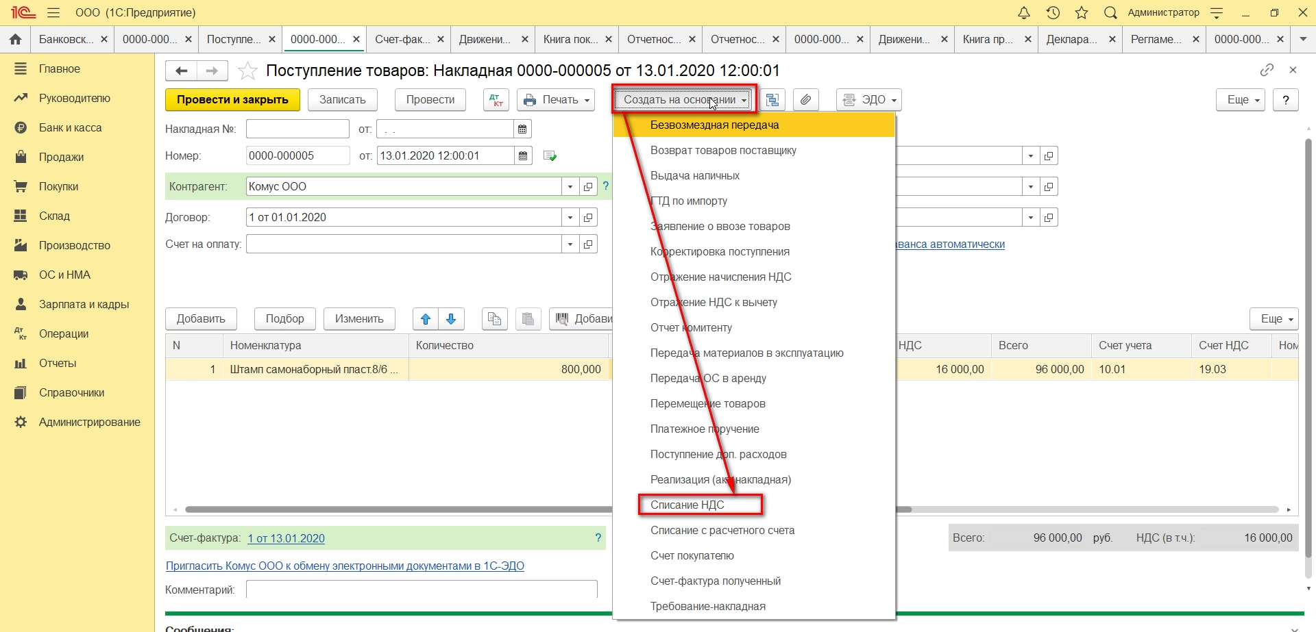 Чтобы НДС не «завис» на счете 19, его надо списать. Документ Списание НДС можно создать на основании поступления.