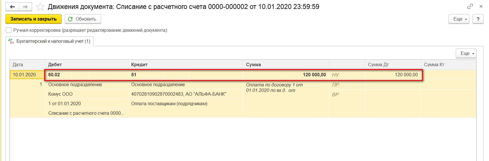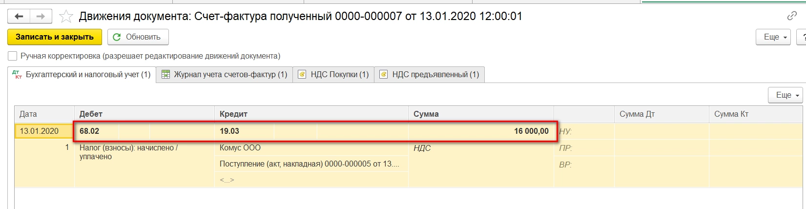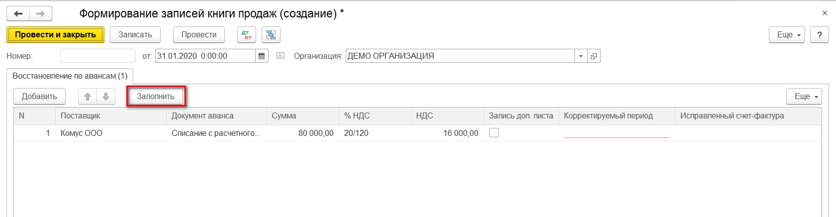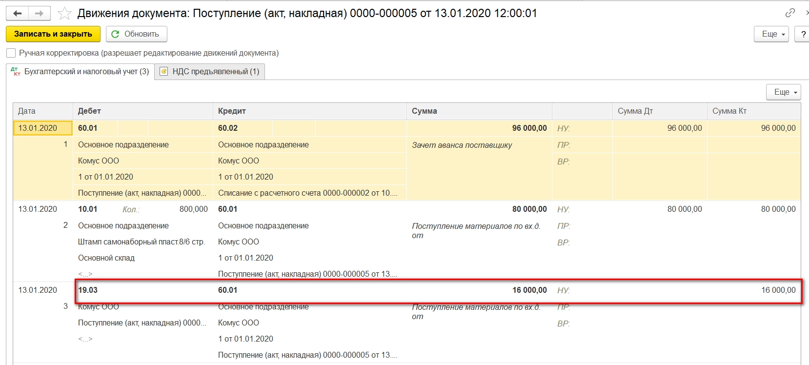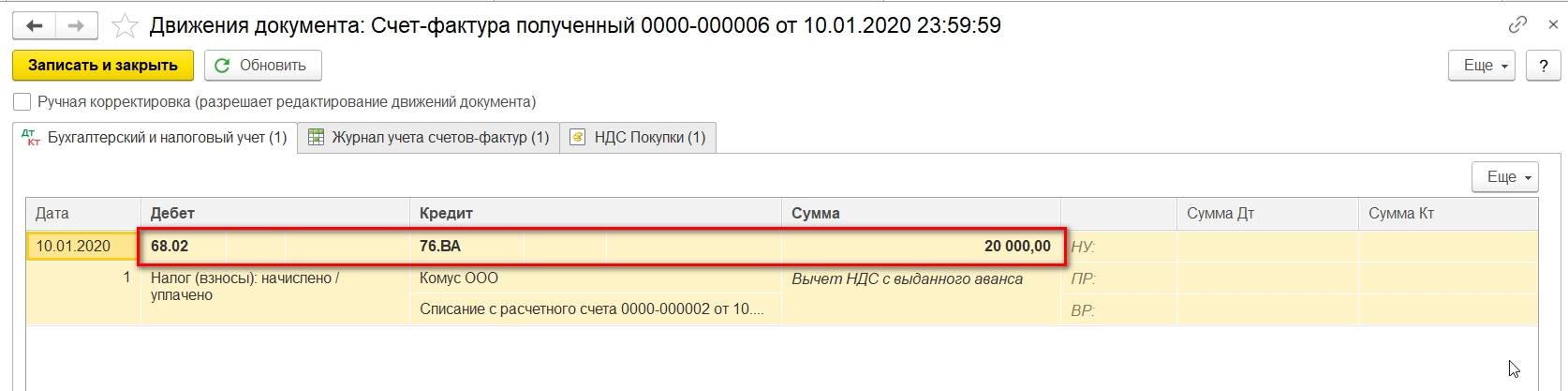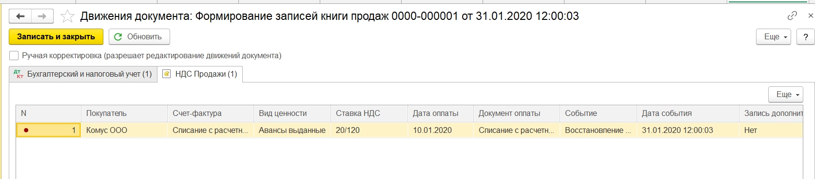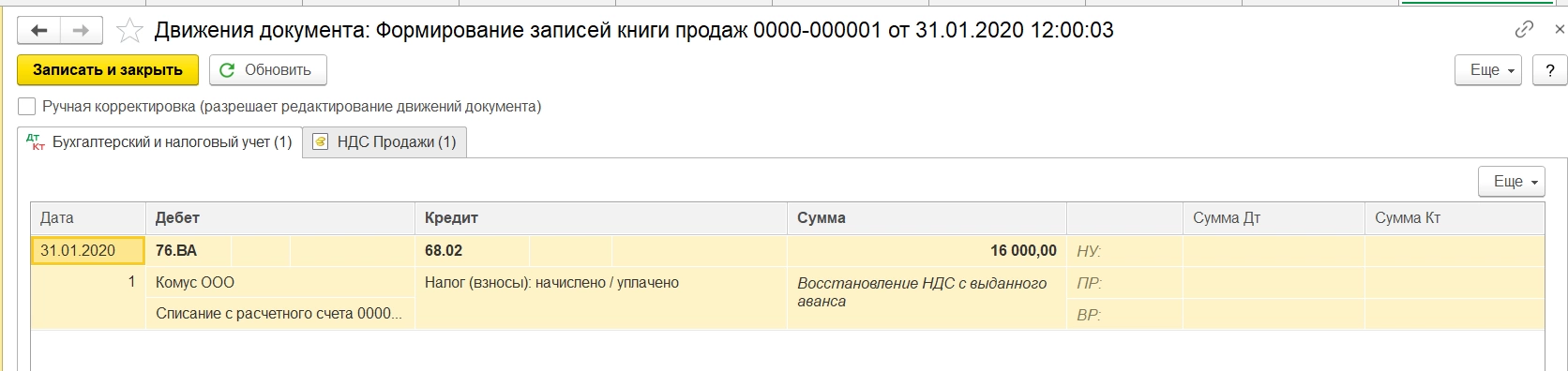 Смотрим проводки. Программа автоматически восстанавливает НДС, анализируя сумму аванса и последующую отгрузки. В нашем случае поставка меньше уплаченных авансовых платежей, восстанавливаем сумму в размере, равной полученной отгрузке от поставщика.