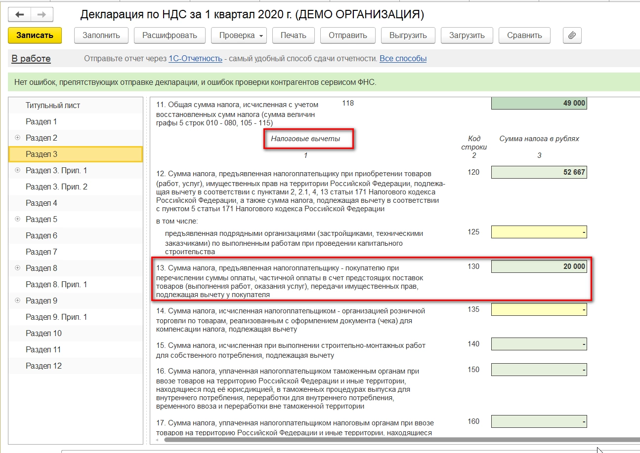 Также в 1С мы отразили вычет по предоплате поставщику.