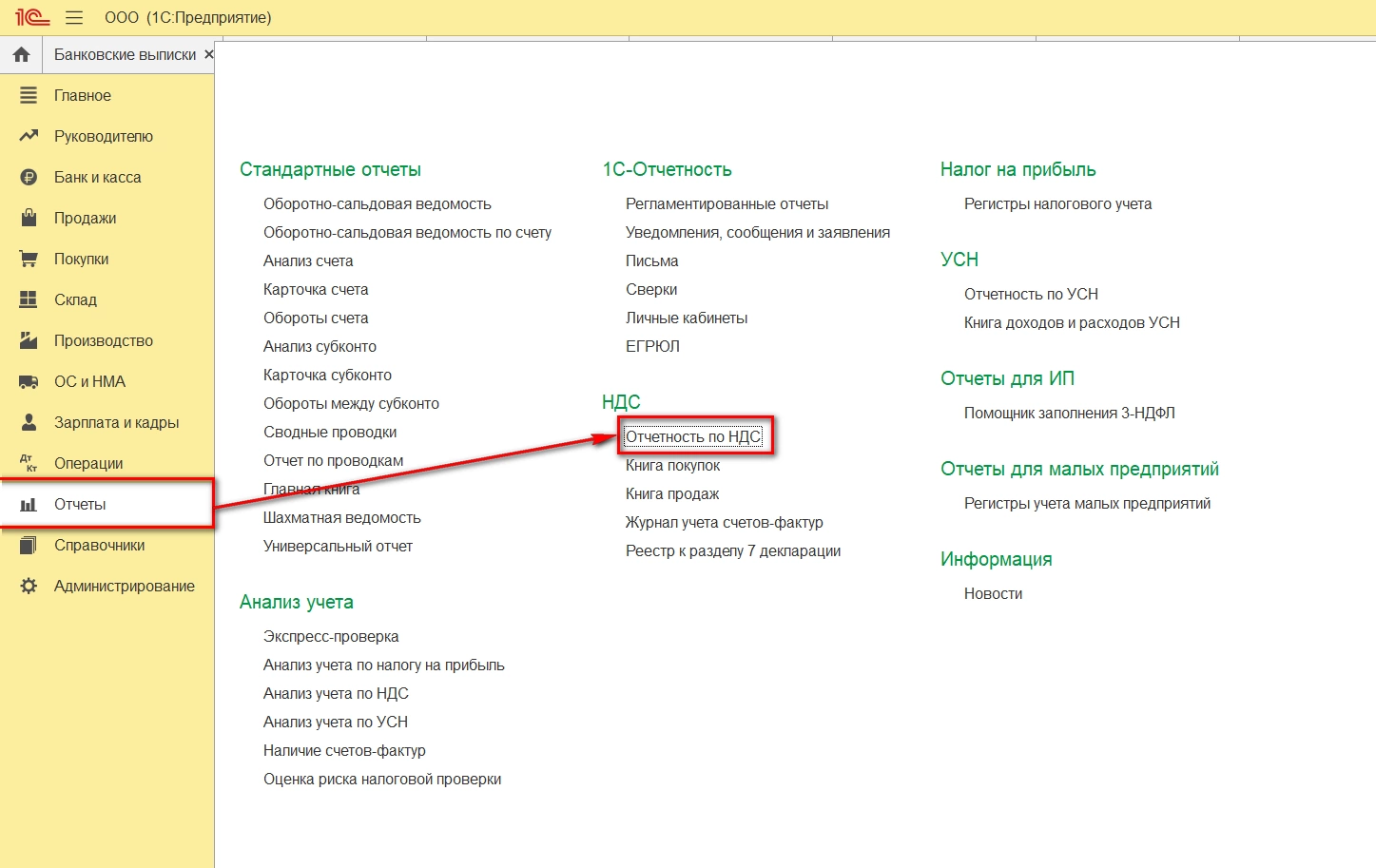 Следует провести восстановление НДС. Для этого в меню Операции выбираем пункт Отчетность по НДС (в предыдущих версиях конфигурации был Помощник по учету НДС).