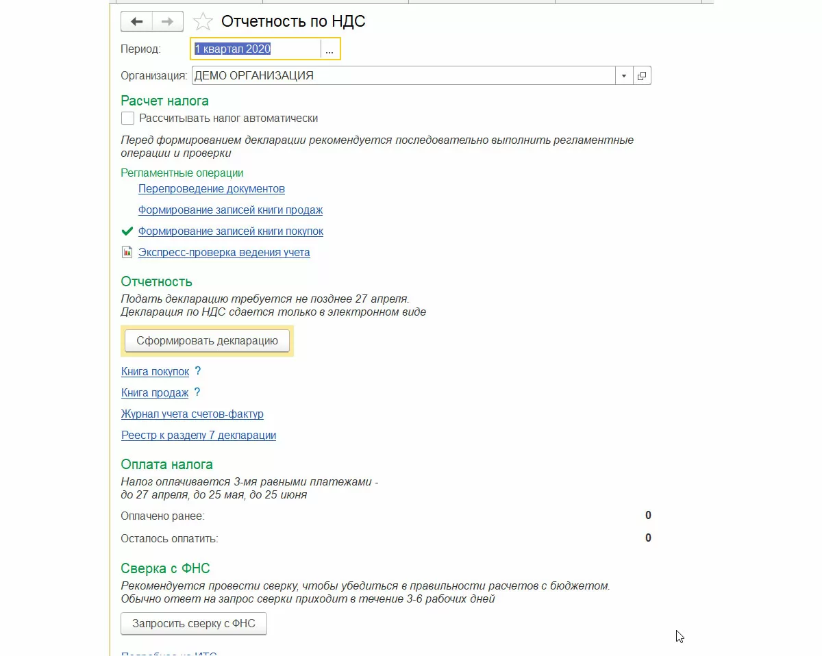 Обработка Отчетность по НДС предлагает перепровести документы и сформировать регламентные операции – формирование записей книги покупок и продаж.
