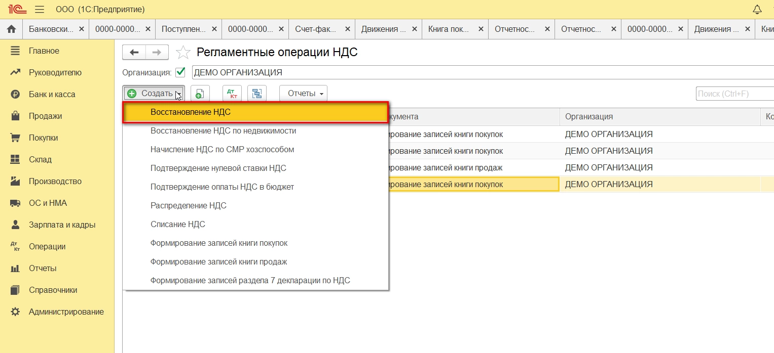 В данном случае программа не может автоматически определить, в каком периоде и объеме следует восстанавливать НДС. Поэтому создаем соответствующий документ Восстановление НДС. Он находится в разделе Регламентные операции НДС.
