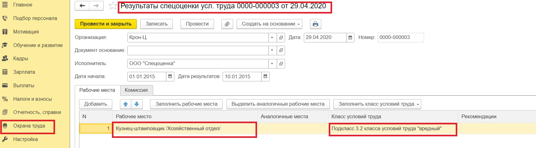 Чтобы зафиксировать в ЗУП результаты спецоценки, необходимо в том же разделе переходим на вкладку результатов и создаем одноименный документ.