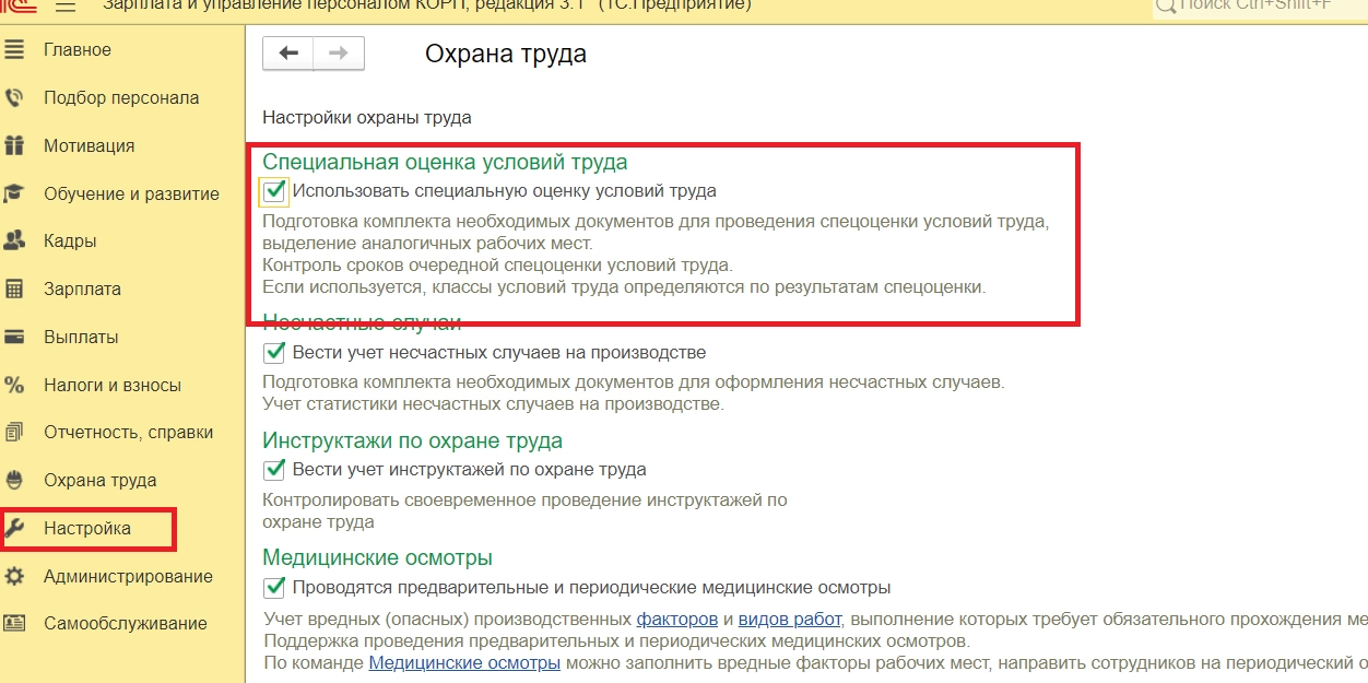 Для начала работы по учету спецоценки, применению дополнительных страховых взносов и начислению надбавок за вредные условия труда, зададим необходимые настройки. Чтобы получать результаты спецоценки условий труда, в «Настройки-Охрана труда» проставляем галочку в соответствующем пункте.