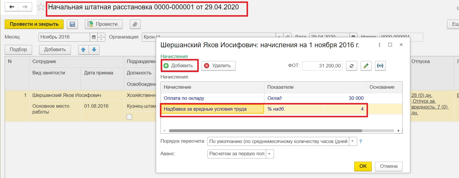 Открываем «Начальную штатную расстановку» и указываем для нашего кузнеца новое начисление в 4% от размера оклада работника.