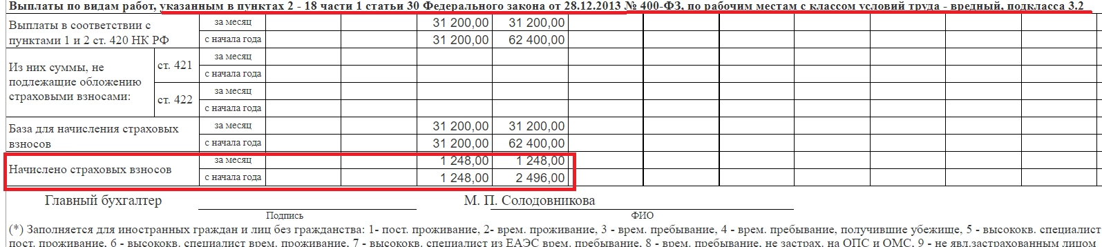 Как видим, доплата была произведена. Поскольку мы провели документ «Результаты спецоценки», где указали класс 3.2 для данной позиции ШР, мы видим, что дополнительные страховые взносы в ПФР соответствуют классу условий труда для нашего рабочего места.