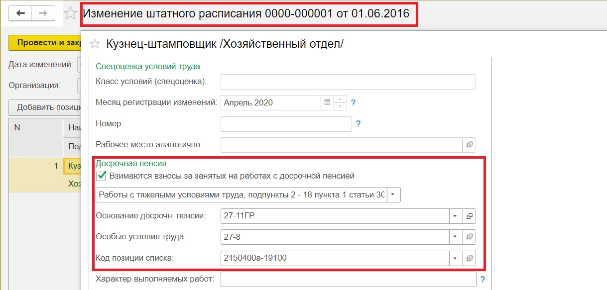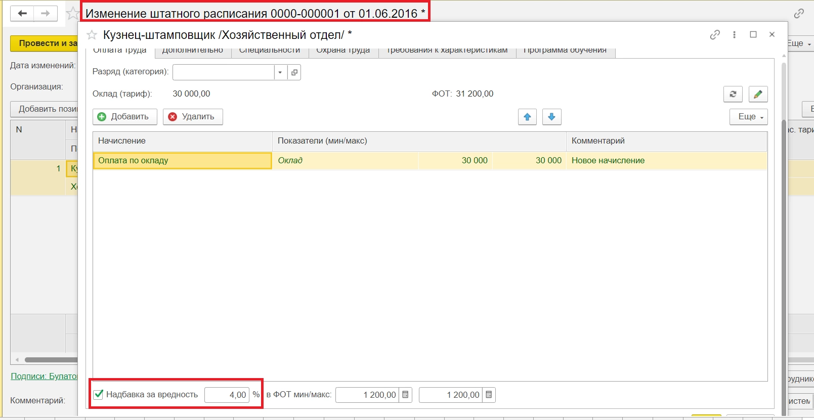 Для того чтобы сотрудникам, принимаемым на должность кузнеца, также назначалась надбавка за вредность, необходимо, как и в случае с назначением дополнительных пенсионных взносов, перейти в документ «Изменение штатного расписания» и в карточке позиции штатного расписания добавить необходимую надбавку. После этого провести документ.