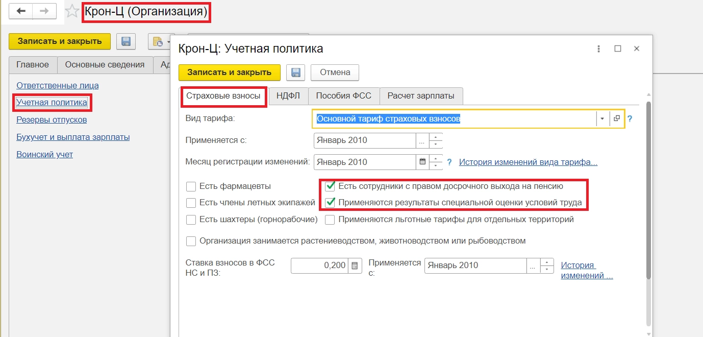 Включаем возможность учета дополнительных страховых взносов в справочнике «Организации», где находим нужное нам юрлицо и жмем «Изменить». Переходим на вкладку «Учетная политика-Страховые взносы» и проставляем галочки на пунктах, как показано на картинке ниже.