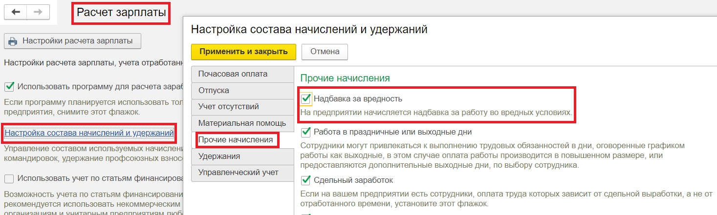 Подключаем надбавку за вредные условия труда в разделе «Настройки-Расчет зарплаты» и далее «Настройка состава начислений и удержаний-Прочие начисления», где находим нужный нам пункт и отмечаем его галочкой.