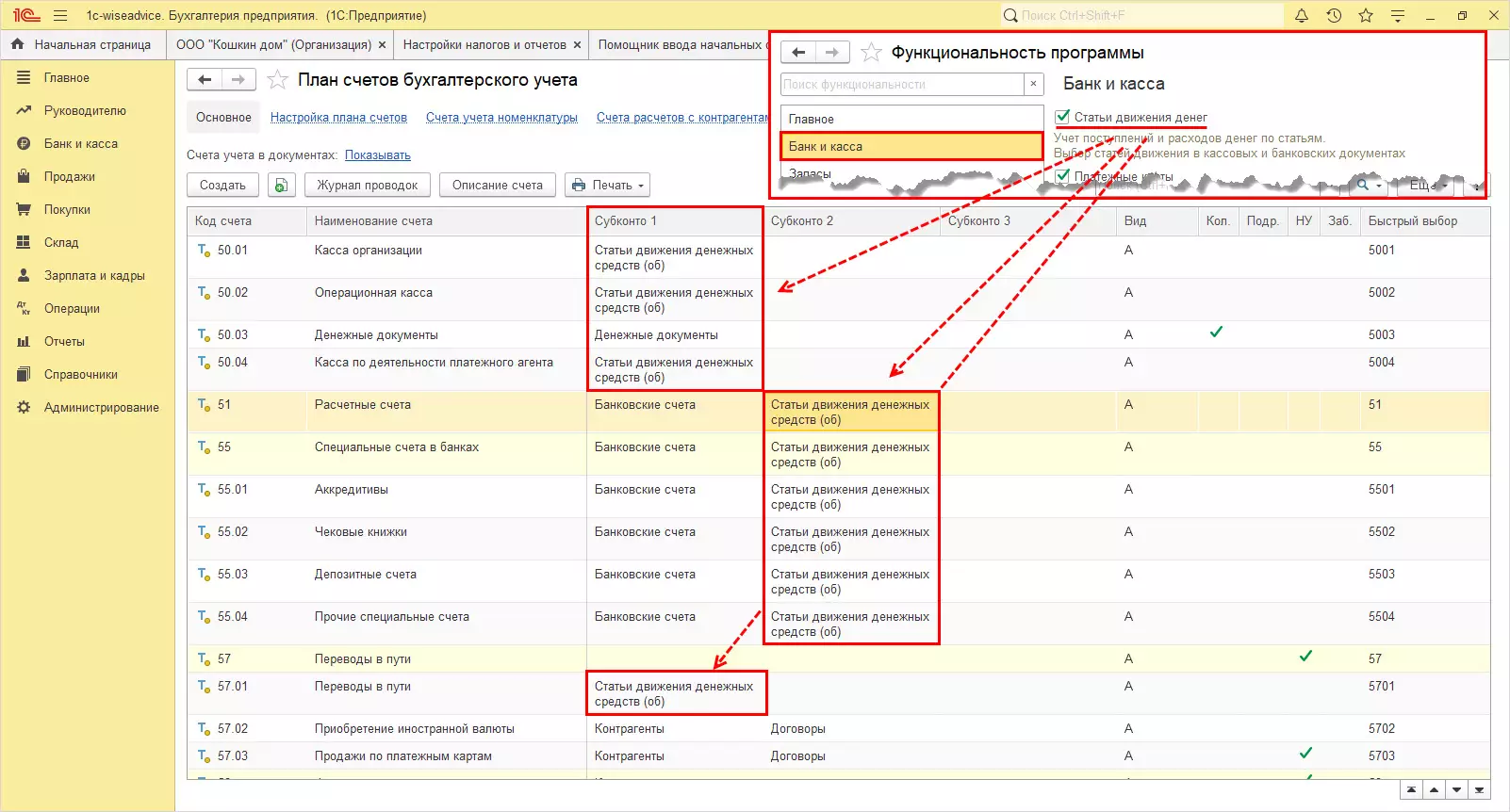 Например, включив настройку функциональности вести учет денежных средств в разрезе статей ДДС, в плане счетов к счетам 50 «Касса», 51 «Расчетные счета», 57 «Переводы в пути» добавляется данное субконто – «Статьи движения денежных средств (об)».