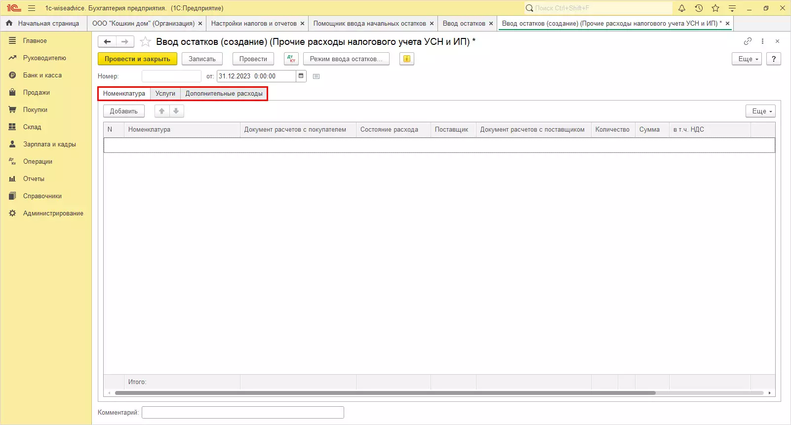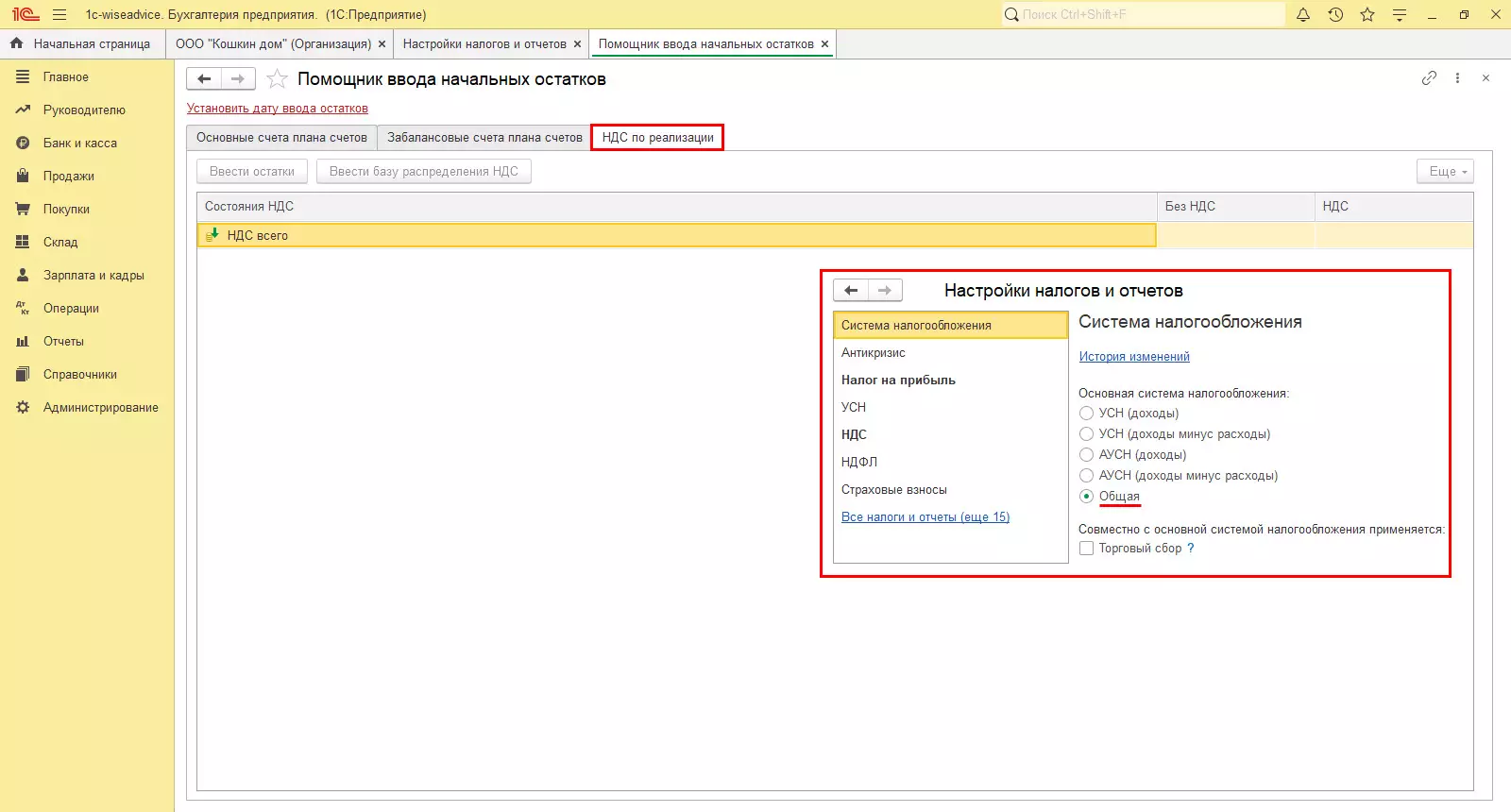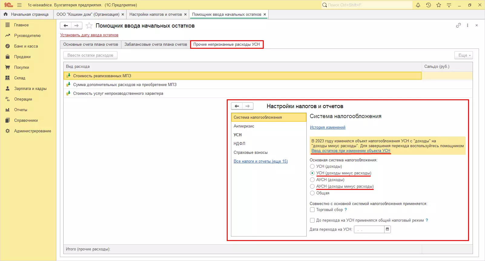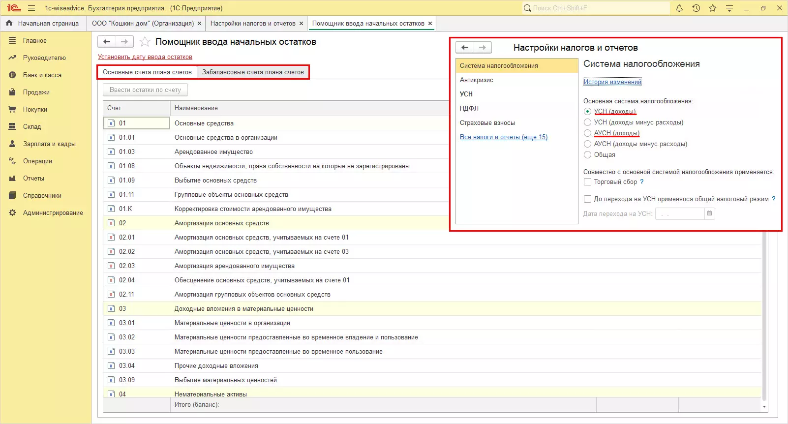 Откройте помощника ввода остатков. Информационная база меняет состав вкладок в зависимости от выбранной системы налогообложения.