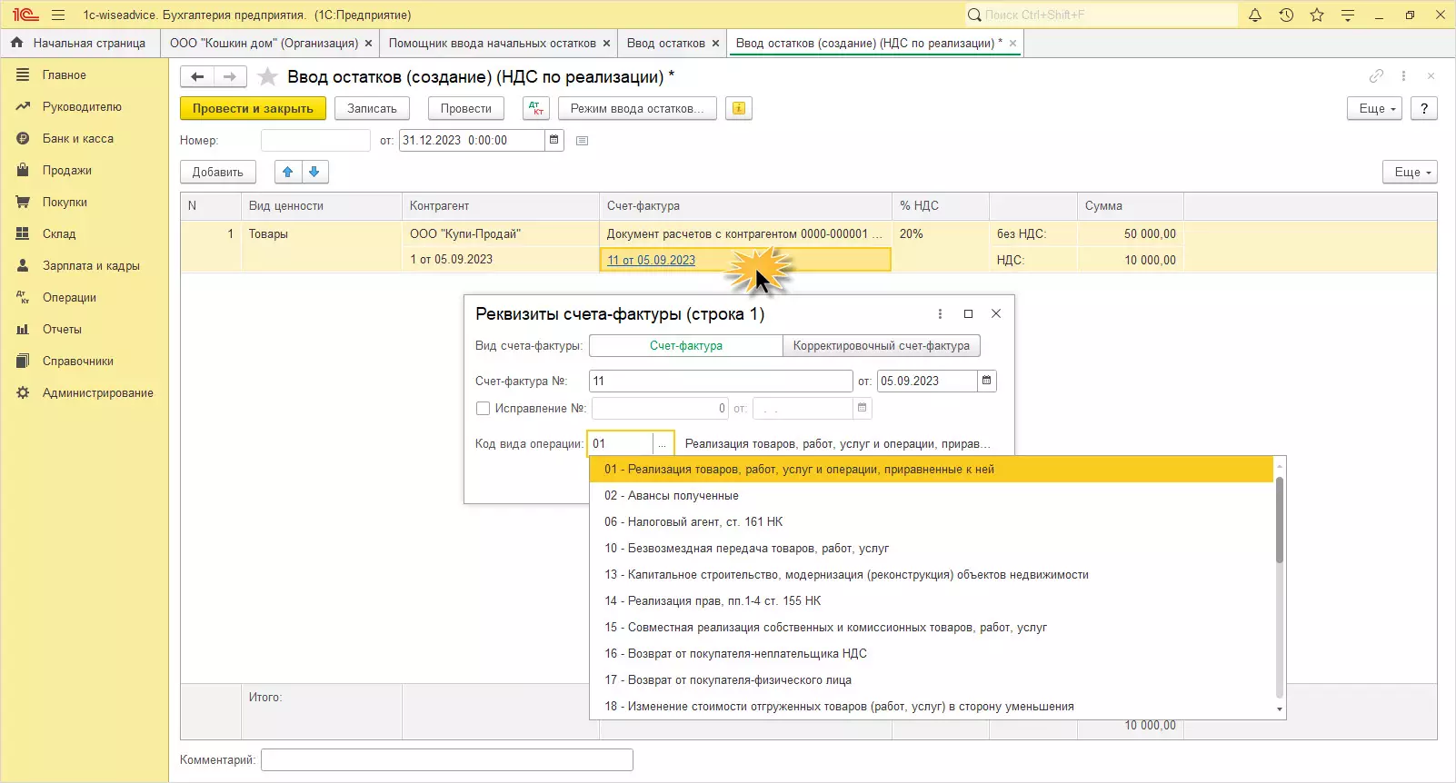 Заполните реквизиты счета-фактуры, указав код операции.