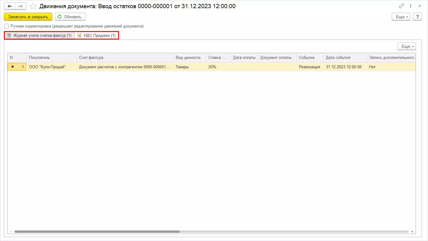 При проведении документа зафиксируется запись в регистры «Журнал учета СФ» и «НДС Продажи».