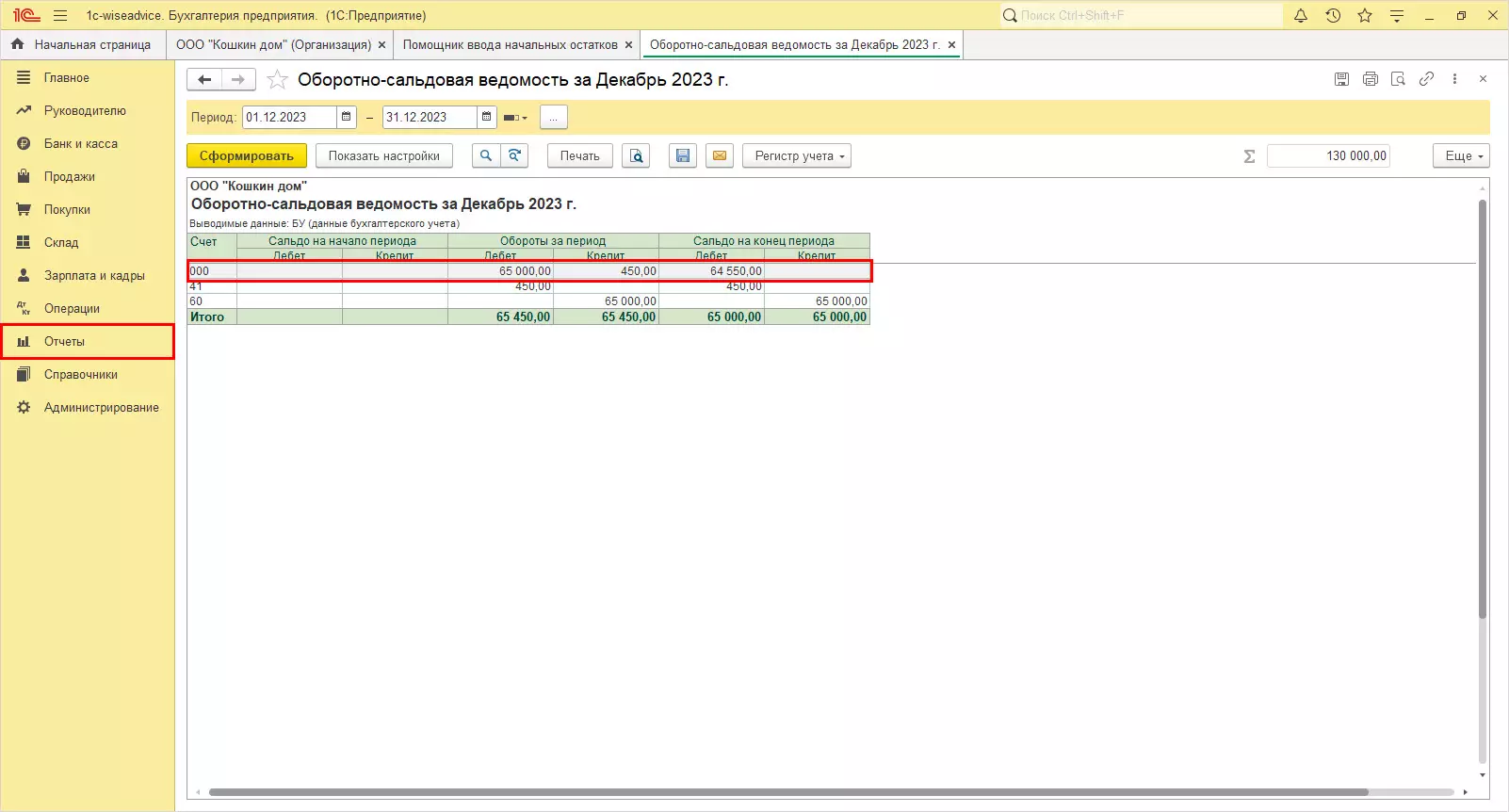 Для проверки правильности ввода остатков, сформируйте ОСВ в разделе «Отчеты». По нулевому счету остатка быть не должно.