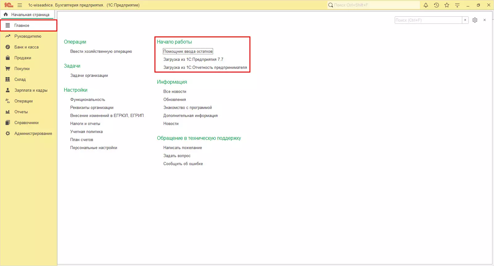 Чтобы внести первоначальные данные в программу, нужно из раздела «Главное» перейти в блок «Начало работы».