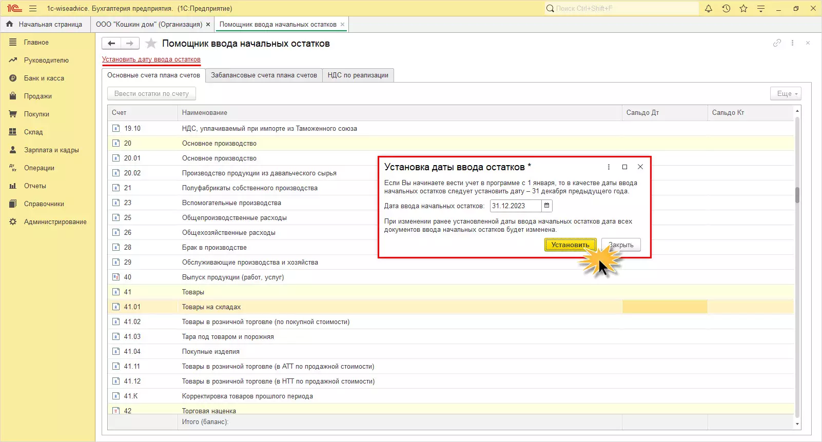 Чтобы начать ввод остатков по счетам БУ, перейдите по гиперссылке «Установить дату ввода остатков» и введите последний день месяца. Рекомендуется начинать вести учет в программе с начала года. В этом случае устанавливается дата – последний день в году, 31.12.2023.