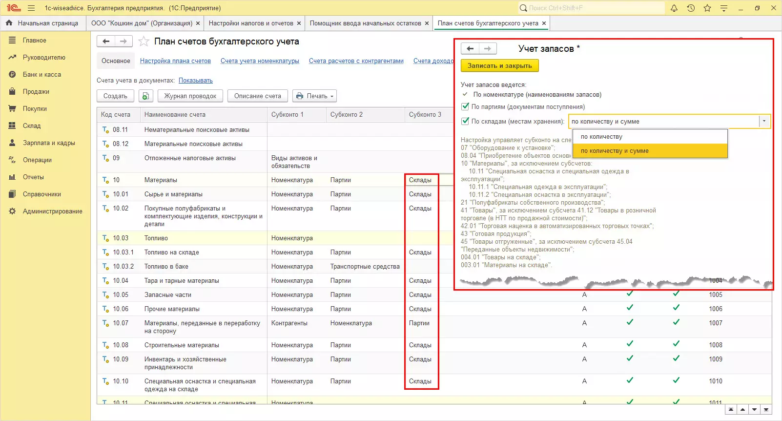 Еще пример: задав в настройке «Учет запасов» в разделе «Параметры учета» – разделение МПЗ по складам (местам хранения), к перечисленным на рисунке счетам (таким как 10, 41, 43 и т.д.) добавится субконто «Склады» и аналитика будет вестись в зависимости от установленной настройки – по количеству или количественно-суммовой учет.