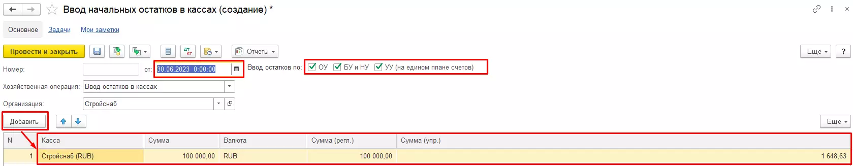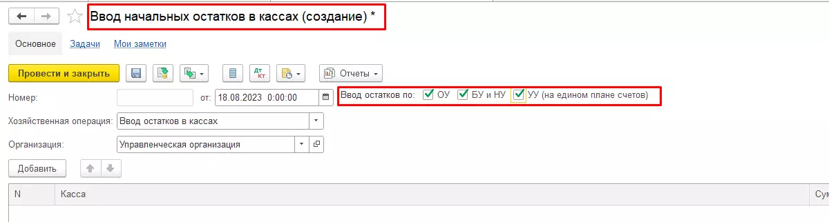 В открывшемся окне отмечаем «галочкой» необходимые типы учета (ОУ, БУ и НУ, УУ), заполняем дату (на которую вводятся начальные остатки по кассе), организацию, остаток денежных средств, валюту и выбираем команду «Провести и закрыть».