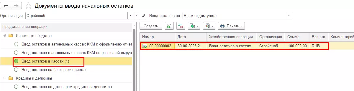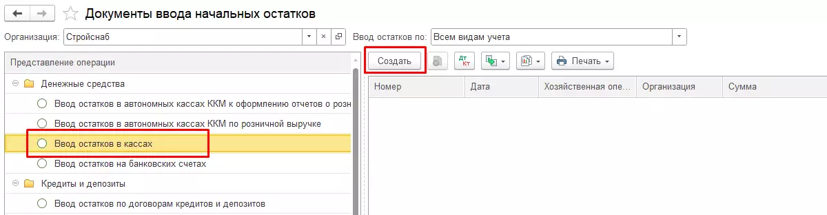 Выберем операцию «Ввод остатков в кассах» и создадим новый документ.