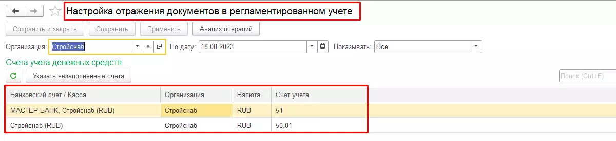 - Для отражения введенных остатков в регламентированном учете требуется предварительно настроить соответствующие счета учета.