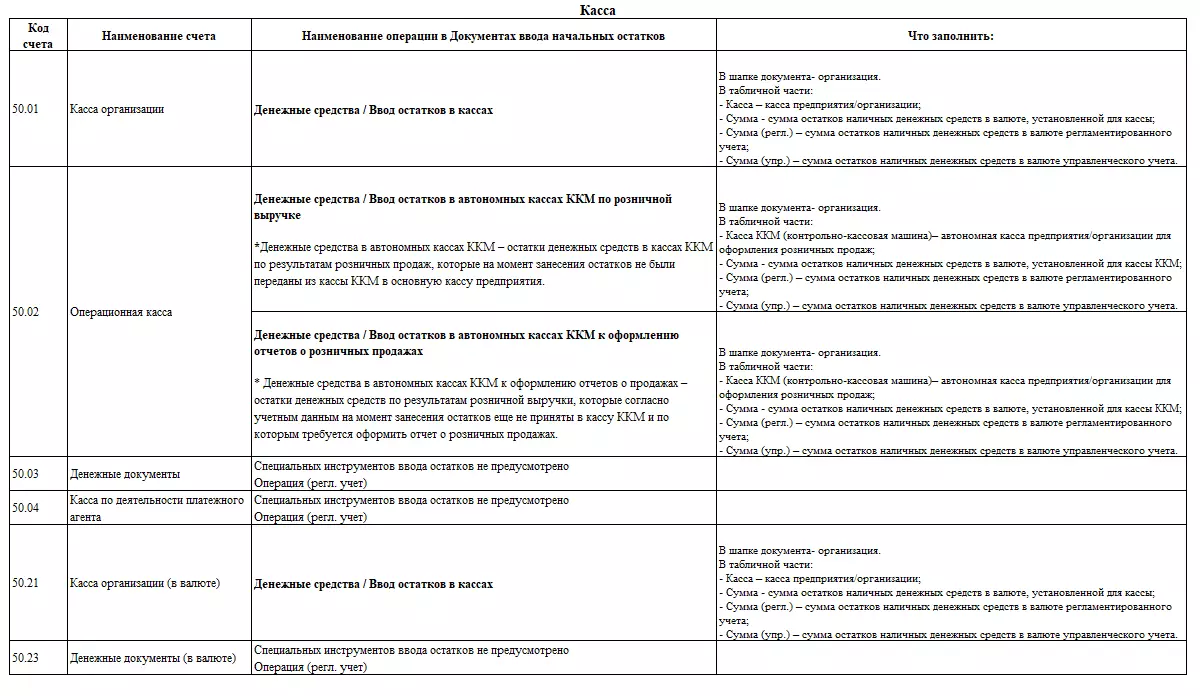 Подсказки для заполнения документов ввода начальных остатков по субсчетам, открытым к счету 50 «Касса», можно найти в таблице.