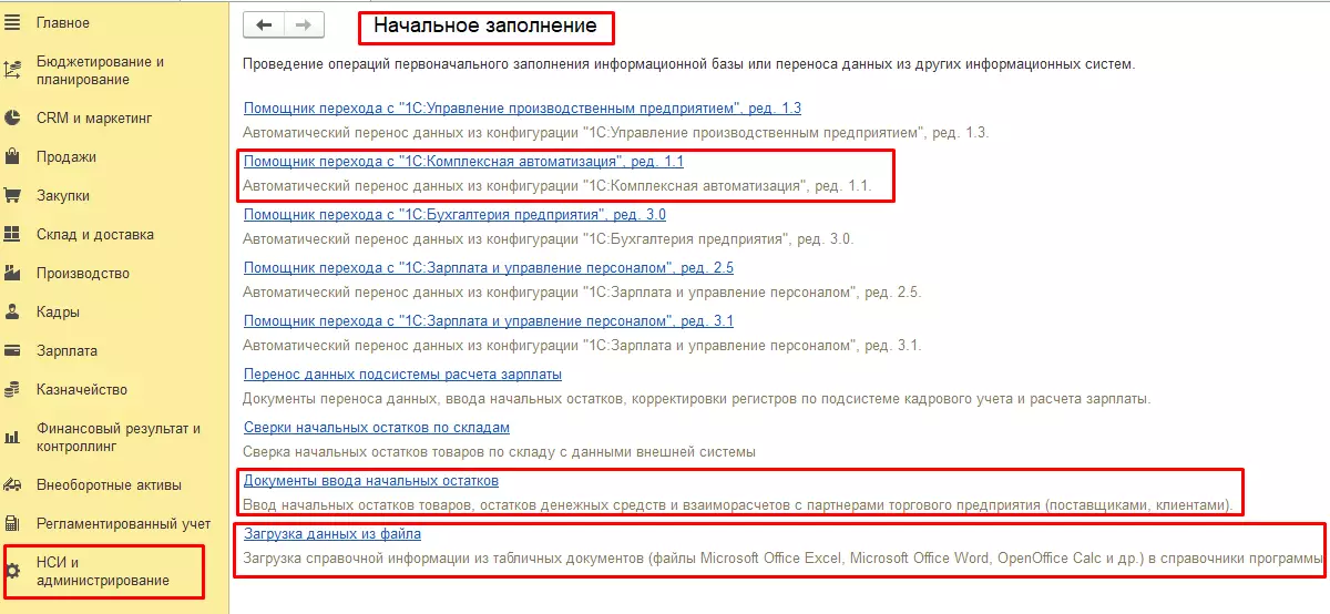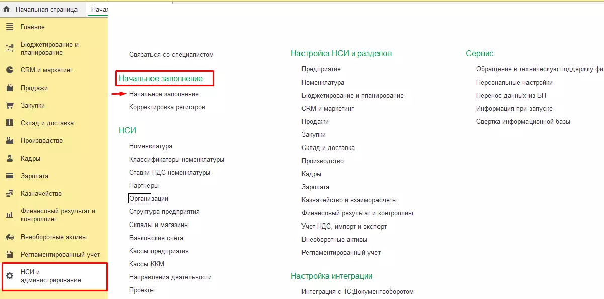 Переходим в раздел «НСИ и администрирование» – «Начальное заполнение».