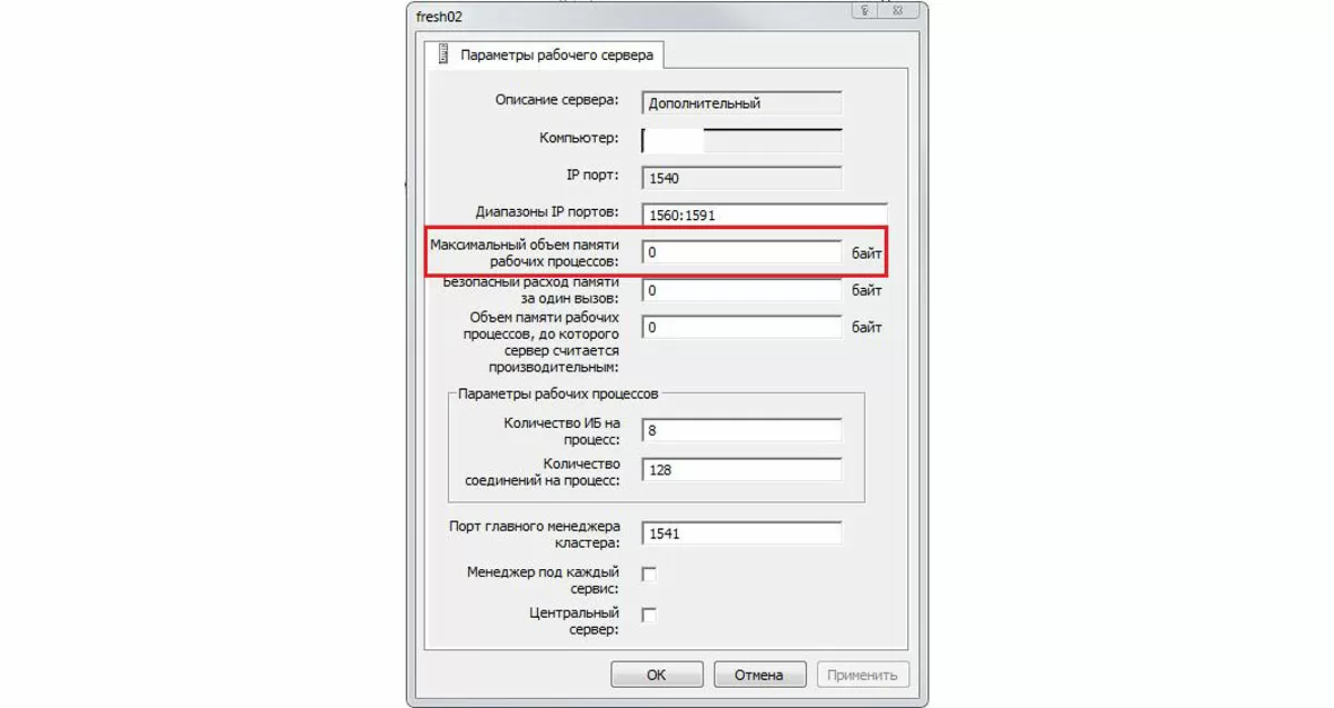Установленное в этом поле по умолчанию значение «0» ограничивает размер доступной памяти на сервере 80% для всех процессов 1С. При большом объеме памяти на сервере, выделенном под 1С, 20 неиспользованных процентов составят довольно большой, но неэффективный объем. Например, в 132 Гб памяти, доступно для процессов 1С будет ~105,6 Гб, а оставшаяся память, за вычетом расходов на сервер, будет не использована. Поэтому для максимально эффективного использования памяти, в этом параметре следует установить значение отличное от нуля.