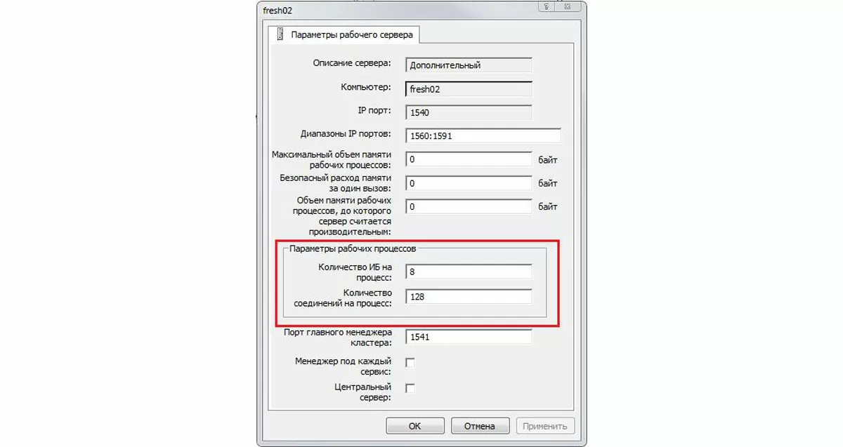 В 64-разрядном сервере «1С:Предприятие» один rphost может полностью использовать и оперативную память, и процессорные ресурсы сервера. Поэтому для 64-разрядного сервера 1С нормальным считается запуск одного рабочего процесса на один сервер. При этом следует учесть аварийное завершение в процессе. В данном случае рекомендуется не менее двух.