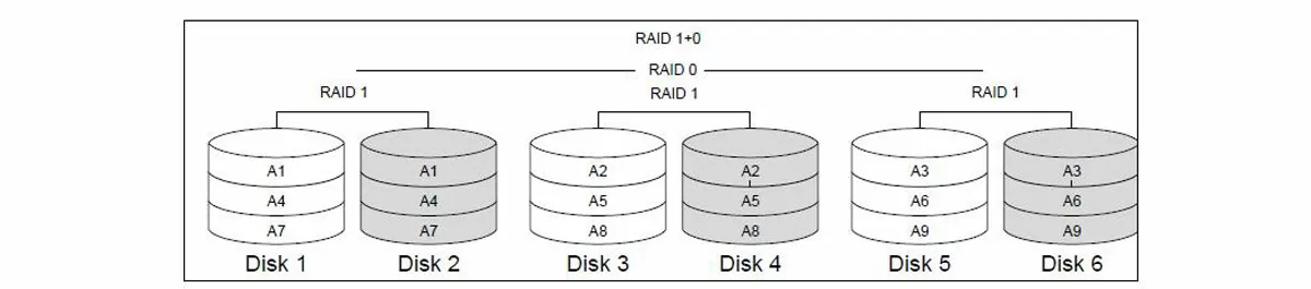 Данный уровень комбинирует 0 и 1 уровень. От 1 уровня заимствуется создания пар «зеркал», а от 0 – объединение в массив. Получаются зеркальные пары, расположенные в массиве, что обеспечивает надежность и производительность. Заметим, что возможно использовать только четное число дисков и, если оба диска в одной из RAID 1 зеркальной пары выйдут из строя в одно и то же время, система больше не будет функционировать.