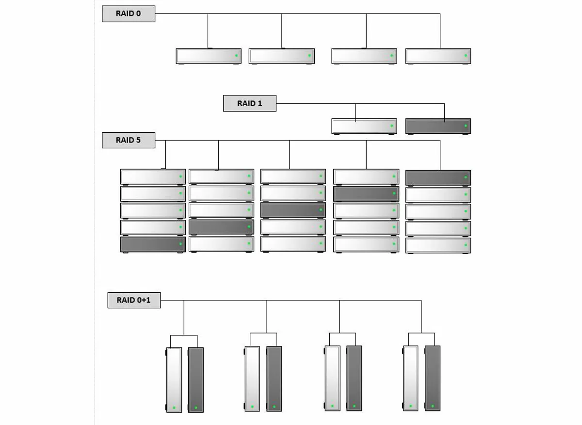 При выборе дискового массива следует также учитывать его отказоустойчивость, которая достигается во многом за счет дублирования информации. Рассмотрим наиболее часто употребляемый и рекомендуемый RAID 10 массив или RAID 1 + 0, известный как «чередование пары зеркал». Это обеспечивает избыточность первого зеркального отображения каждого диска, используя RAID 1, а затем чередование зеркальных дисков, с поддержкой RAID 0, повышает их производительность.
