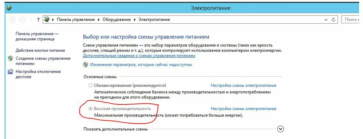 - Для эффективного использования тактовой частоты процессора настройте схему управления питания и установите ее в положение «Высокая производительность».