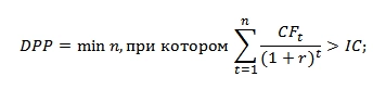 Дисконтированный срок окупаемости (DPP) – период, в продолжение которого проект находится на стадии самоокупаемости. Формула расчета срока окупаемости: