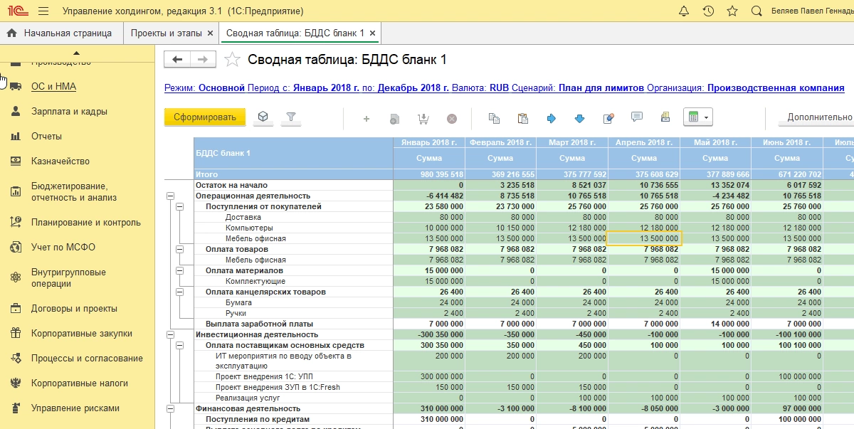 Фундаментом для прогнозирования стоимости проекта служат плановые данные бюджетов доходов и расходов (БДР) и поступлений и списаний денежных средств (БДДС). Потенциал «1С:Управление холдингом» дает возможность осуществить планирование бюджетных форм БДДС и БДР отдельно для любого проекта. Для формирования бюджетной формы сразу на весь календарный год создан инструмент «Сводная таблица».